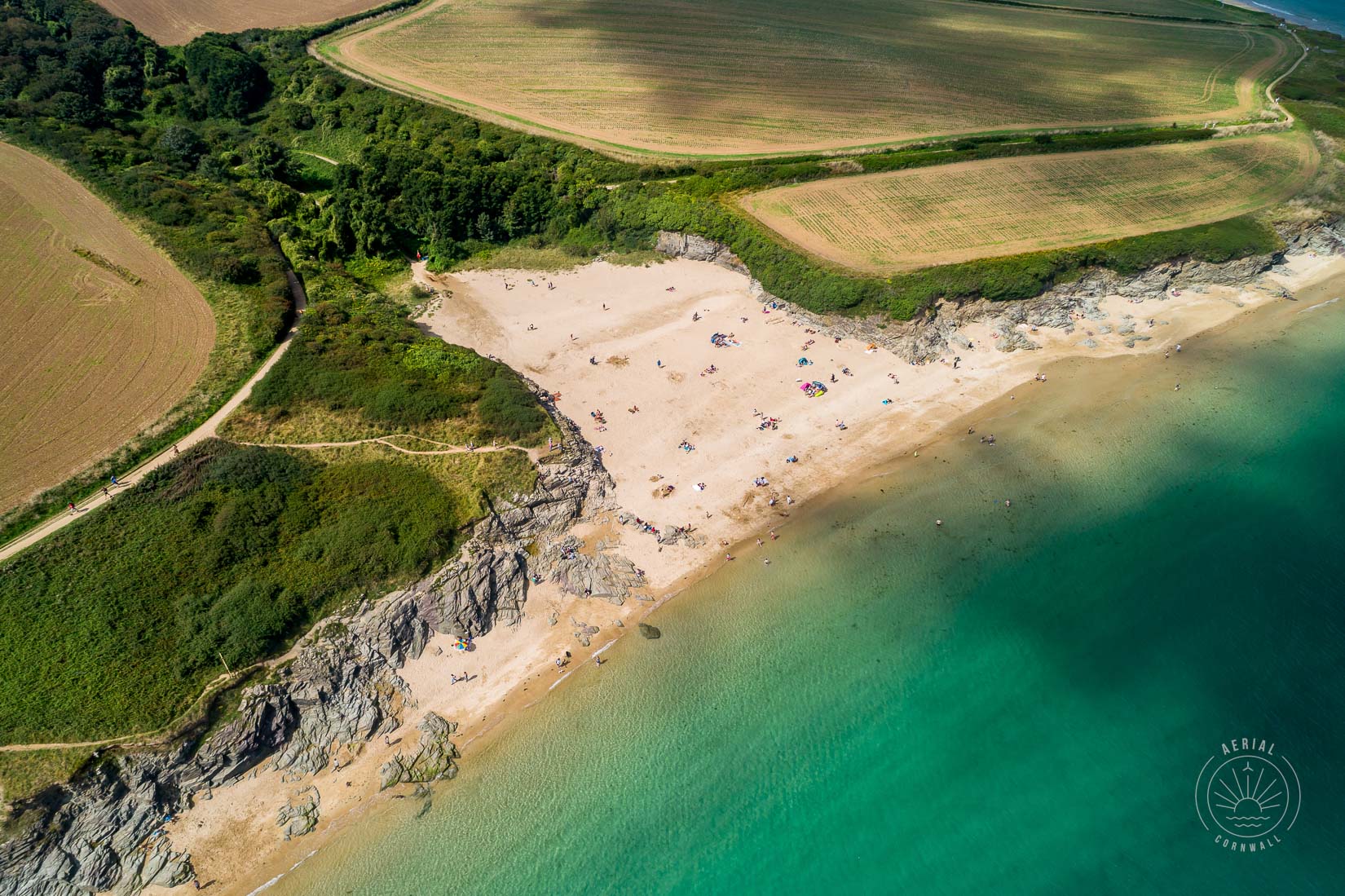 Fine art aerial photography print over St George’s Cove on the Camel Estuary, Cornwall.