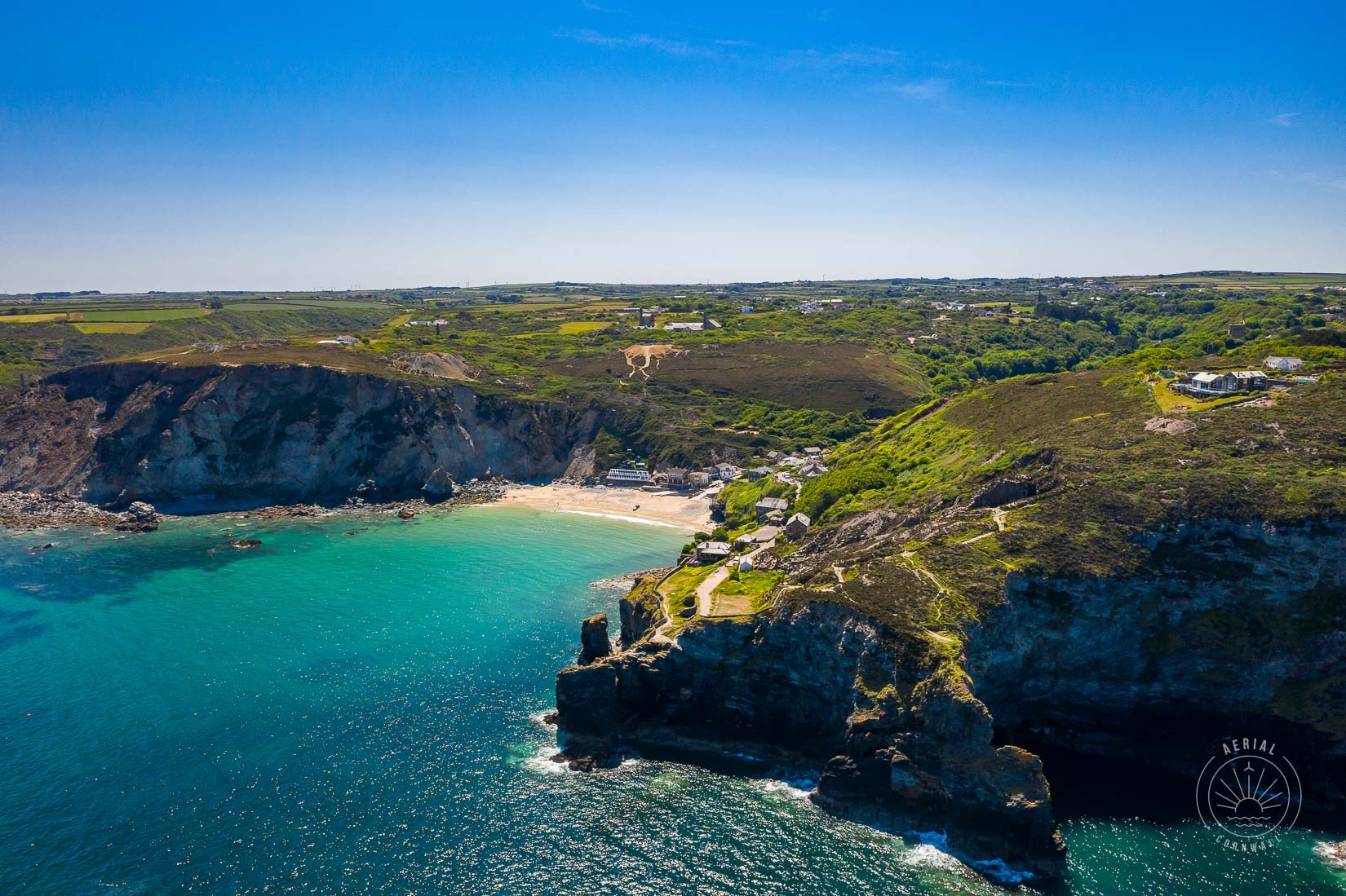 Fine art aerial photography print of a high elevation view of Trevaunance Cove near St Agnes, Cornwall.