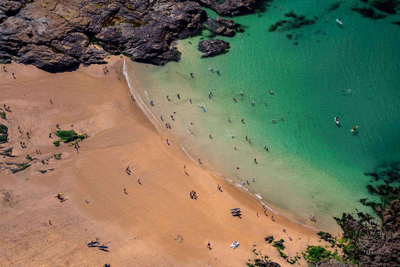 Fine art aerial photography print of a tranquil summer’s day at Trevone Bay, Cornwall.