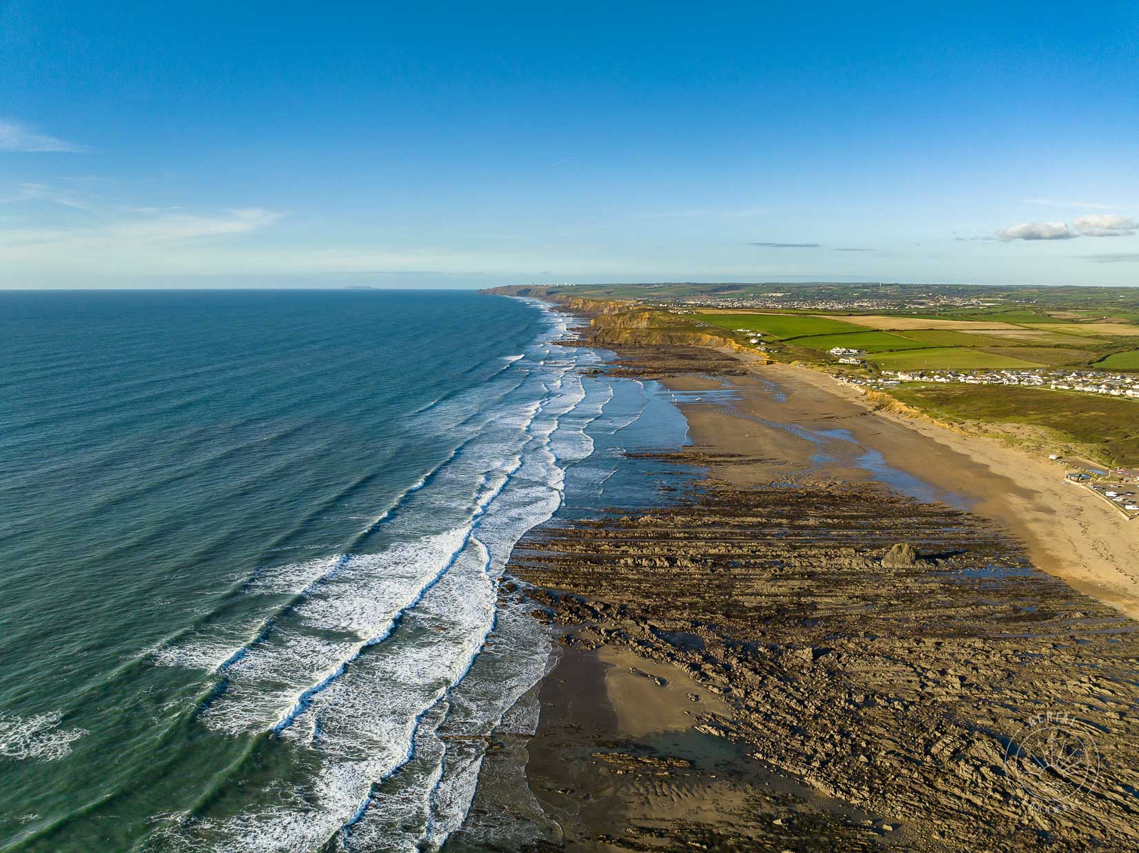 Fine art aerial photography print of Widemouth Bay near Bude, Cornwall.